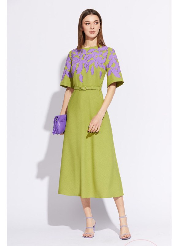 Платье салатовое ниже колена с фиолетовыми цветами.